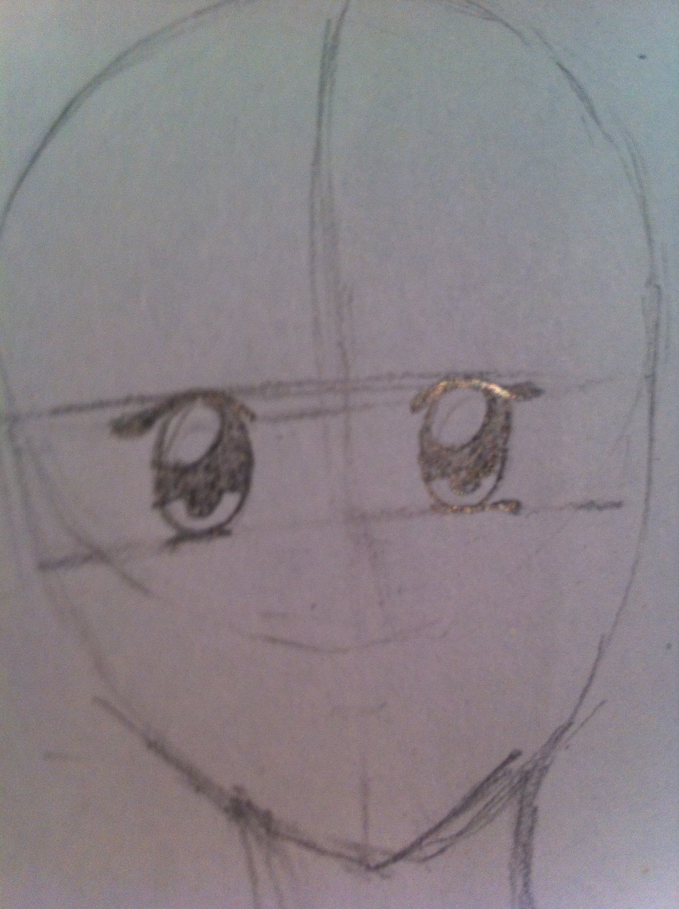 Step 6: Now we are going to draw in the eyes. To draw them, draw two ovals on either side of the middle line going down the face. There are many was on drawing anime eyes, but this is one of them. then just draw in the shiny bits shown in the picture. If you want to, you can create your own eye look.